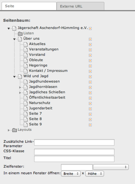 Seite zeigt Ihnen alle Seiten Ihrer Webseite. Klicken Sie auf die gewünschte Seite, das Fenster wird geschlossen und der Verweis auf die Seite wird in das Linkfeld eingefügt.