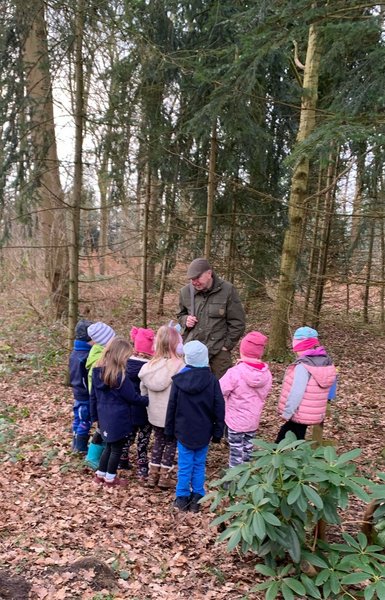 Bei dem Revierbegang sollte die Neugier auf Wald, Flur und Wild geweckt werden. Die Kinder suchten daraufhin, auf einem vorgegebenen Naturpfad, nach tierischen Spuren. Hierzu wurde eine kleine Wegstrecke im Waldgrundstück von Familie Grimm mit einigen Tierpräparaten, Spuren wie Federn, Eierschalen, Abwurfstangen, Knochen und Schädeln, die auch so in der Natur vorgefunden werden können, präpariert. Die Kinder und Eltern stellten sehr viele Fragen zu den vorgefundenen Exponaten und es entwickelten sich sehr interessante Gespräche.