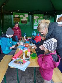 Die Jugendgruppe „Die Falkenaugen“ des Hegeringes Rastede Nord hatte sich überlegt mit Besucherkindern Waldtiere und -figuren aus Naturmaterialien zu basteln. Hierzu wurden im Vorfeld Baumscheiben, Kiefernzapfen, Moos und vieles weitere im Wald gesammelt. Das Bastelangebot wurde von den Besucherkindern sehr gut angenommen.