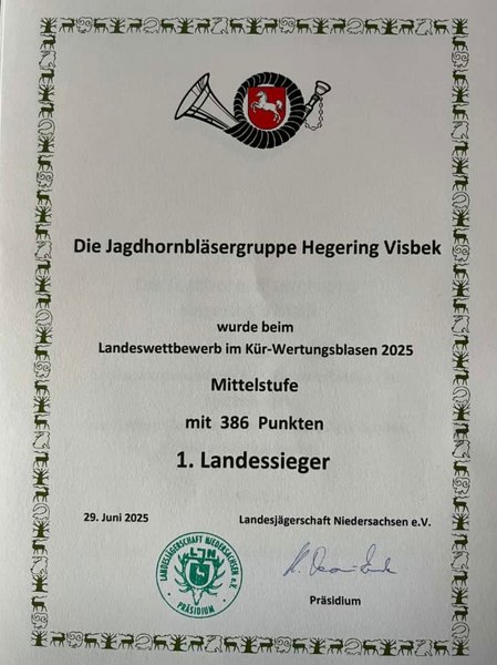 Die Bläserrotte konnten sich nach dem Wettbewerb am Jagdschloss Landesmeister 2022 nennen. Sie verteiligte damit ihren Titel aus dem Jahr 2018. Die Visbeker erhielten für ihren Vortrag 966 Punkte und sind zum 3.Mail in der höchsten Klasse A Landesmeister. Sie haben sich somit wieder für die Deutsche Meisterschaft qualifiziert.