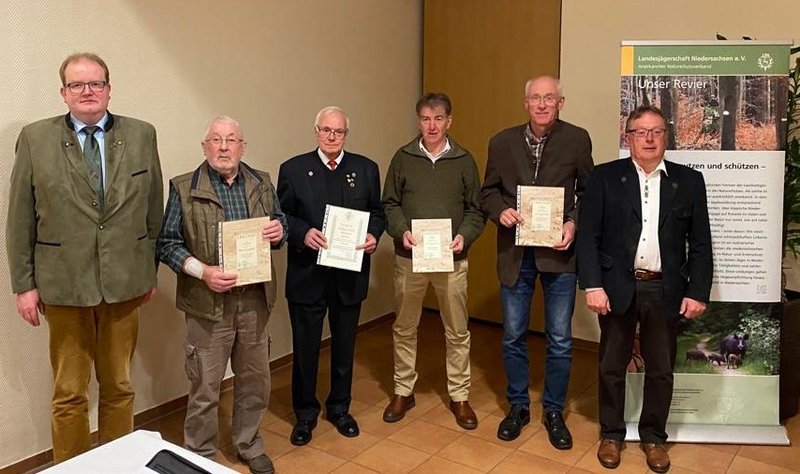 Der Jägerschaftsvorsitzende Lambert Fischer und sein Stellvertreter Bernd Sieve zeichneten für seine 60-jährige Mitgliedschaft in der Jägerschaft bzw. der LJN Heinrich Gerdes aus. Bernd Korte aus Lorup erhielt für seine langjährige Vorstandstätigkeit im Hegering Lorup die Verdienstnadel in Bronze der Landesjägerschaft Niedersachsen (LJN) und Ansgar Simme aus Sögel für seine Leistungen im Bereich der Jungjägerausbildung und Bläsergruppenarbeit die DJV-Verdienstnadel in Bronze.