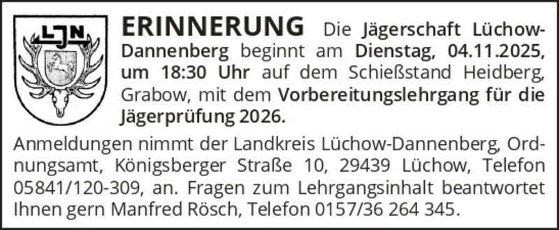 Anmeldungen zum Lehrgang sind bis zum 21. Oktober 2025 unter Angabe von Vor- und Nachnamen, Anschrift, Geburtsdatum, Beruf, Telefonnummer und E-Mail-Adresse an den Landkreis Lüchow-Dannenberg, Ordnungsamt, Königsberger Straße 10, 29439 Lüchow, Telefon 05841/120-309, zu richten.
