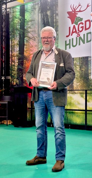Preisverleihung auf der Jagdmesse "Jagd und Hund" in Dortmund für Jagdbuchautor Heinz Adam .