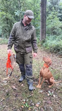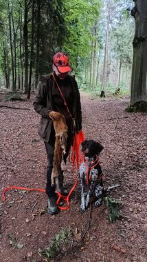 Schweißarbeit bezeichnet die Suche von verletztem Wild. In der Prüfung wird dies mit einer künstlichen Geruchsfährte simuliert.
