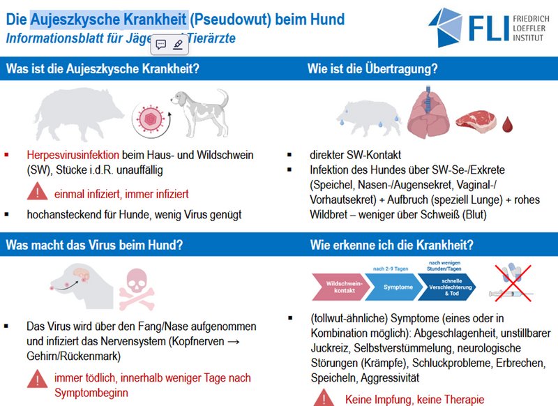 Das Friedrich-Loeffler-Institut (FLI) hat ein aktuelles Informationsblatt zur Aujeszkyschen Krankheit (Pseudorabies) beim Hund herausgegeben.