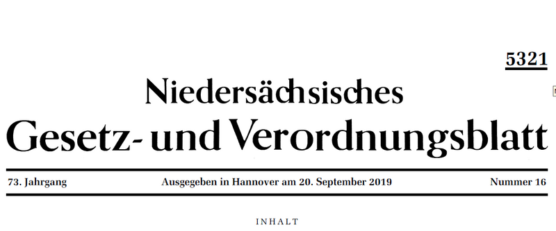 Mit der Veröffentlichung im Niedersächischen Gesetz- und Verordnungsblatt am 20.09.2019 ist die Verorndnug zur Änderung der Verordnung zur Durchführung des Niedersächischen Jagdgesetzes in Kraft getreten.